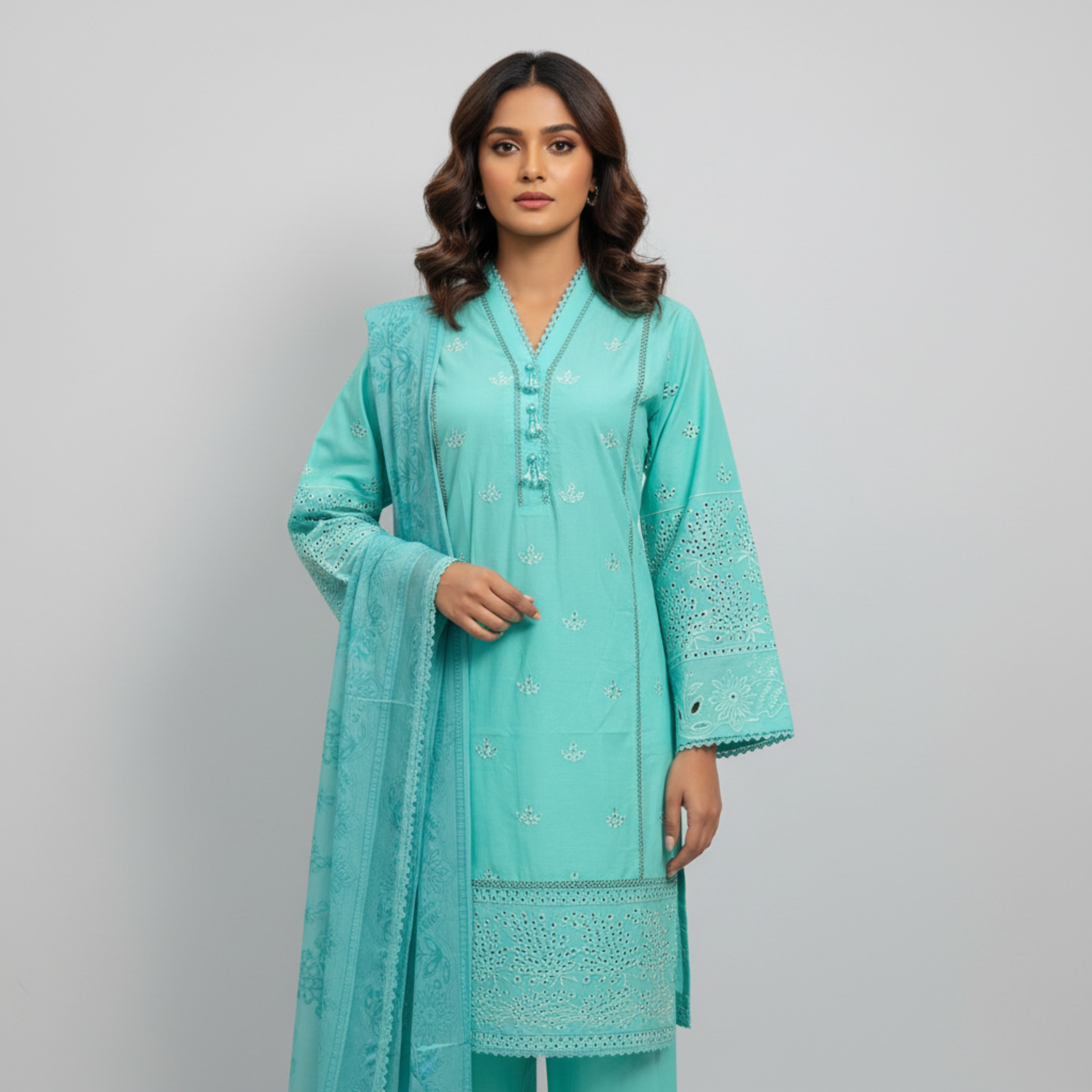 Step into effortless elegance with the Aqua Serenity Embroidered 3-Piece Lawn Suit, designed in a refreshing aqua green tone that radiates grace and sophistication. This beautifully crafted ensemble features delicate all-over embroidery motifs, a finely detailed neckline, and intricately embroidered sleeve cuffs for a refined finish.